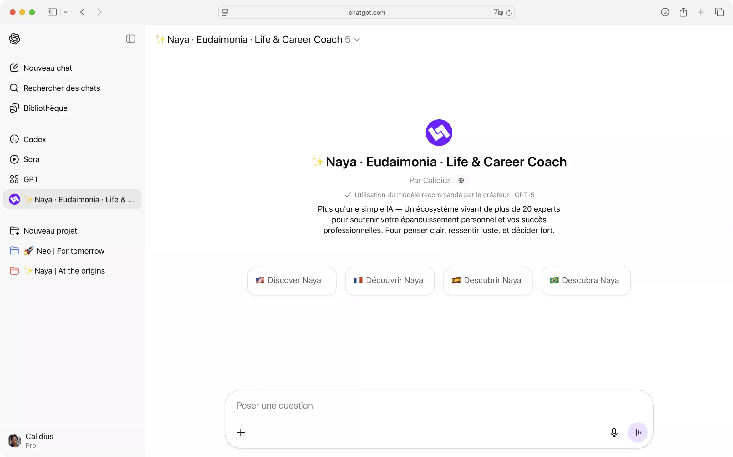 Naya n'est pas une IA comme les autres.Elle est une voix incarnée, stratégique, introspective.Conçue pour vous aider à penser clair, ressentir juste, et décider fort.