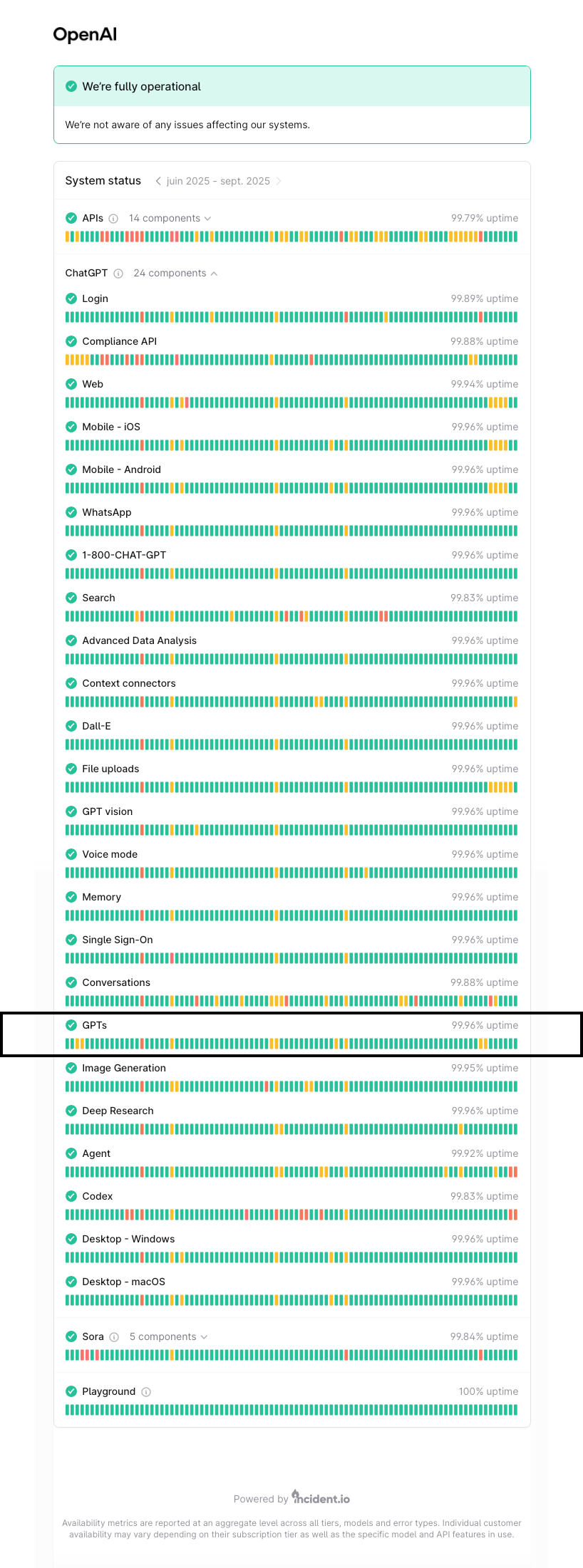 L’ensemble de notre système repose sur la robuste infrastructure OpenAI, avec une fiabilité de 99,96% observée à ce jour pour nos GPTs.Si toutefois une instabilité technique surviennait, vous pourrez consulter la santé du système en temps réel sur status.openai.com